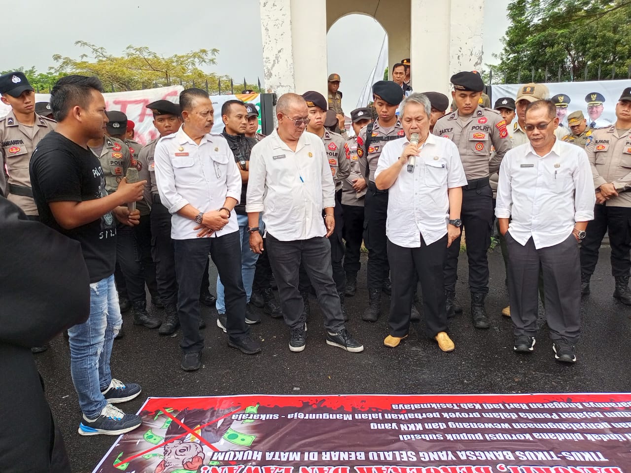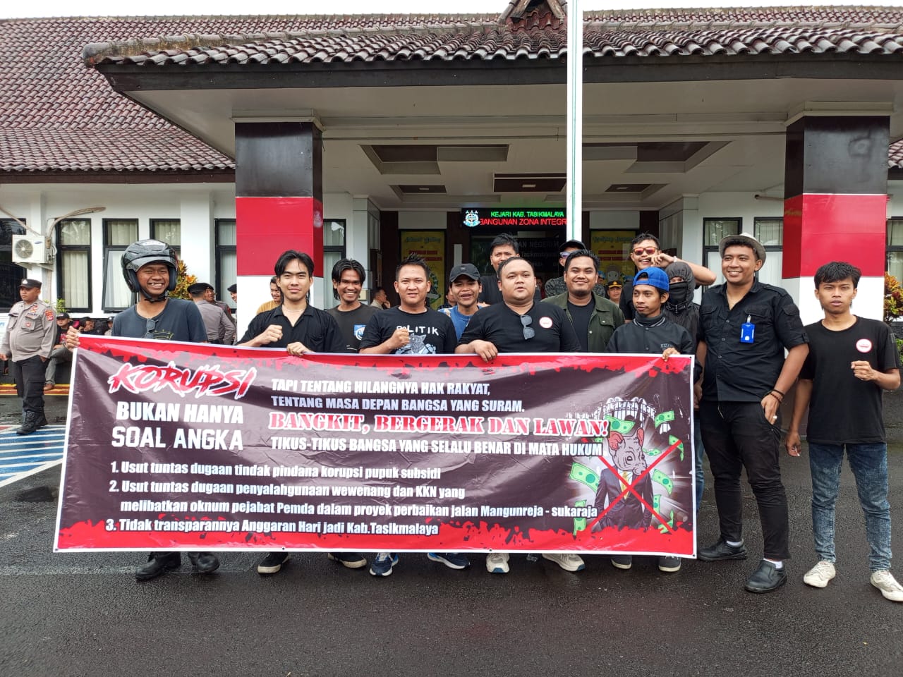 Dari pantauan di lapangan, sebelum menggelar aksi unjuk rasa di Kantor Kejari Kabupaten Tasikmalaya, di bawah guyuran hujan dan pengawalan ketat aparat kepolisian dari Polres Tasikmalaya, Fortabes menggelar aksi unjuk rasa di depan gebang masuk gedung bupati (gebu).