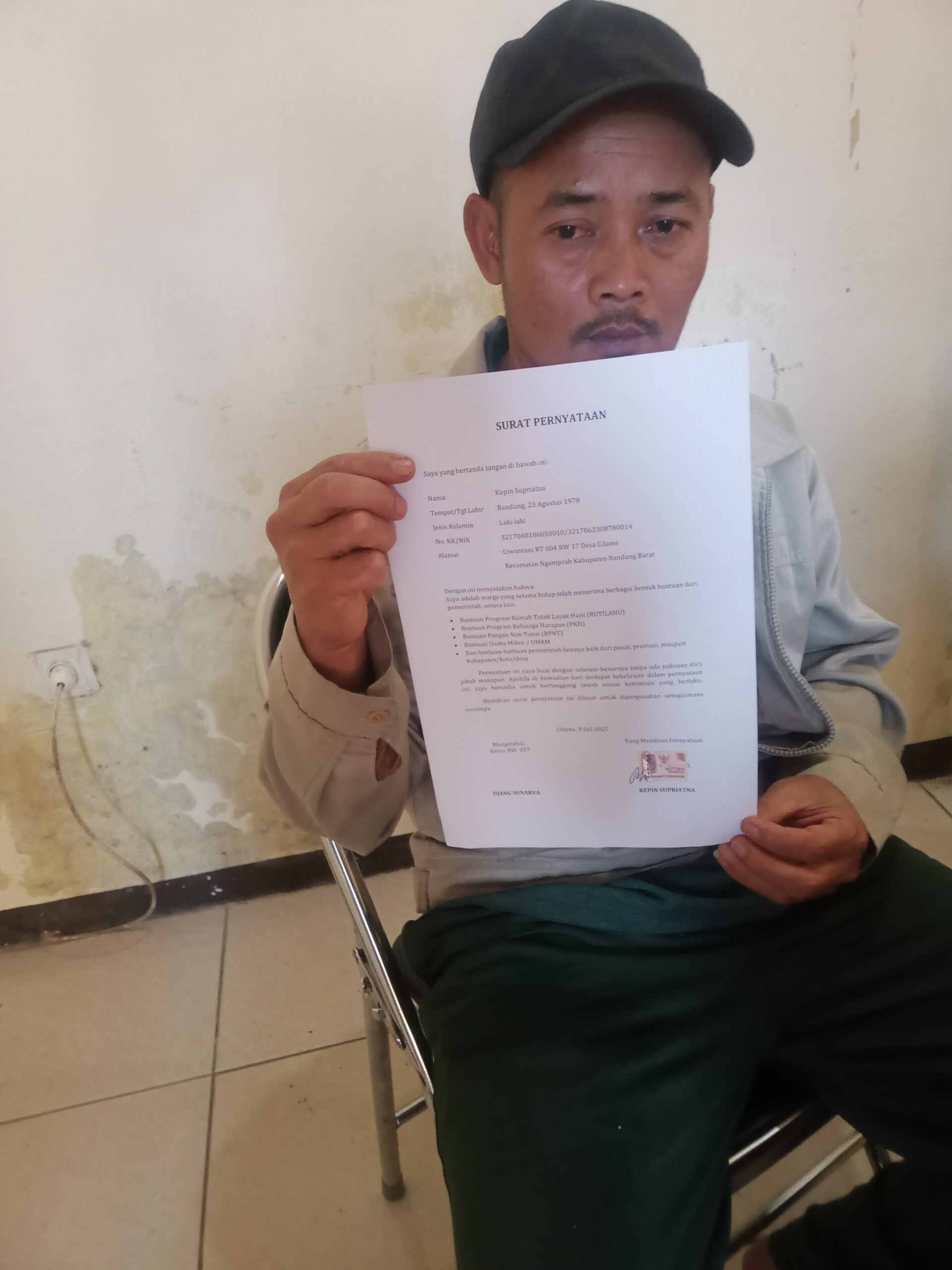 mengakui bahwa dia mendapatkan bantuan dari desa cilame berupa Rutilahu,PKH dan UMKM, hal itu diakui kepin sekaligus membuat surat pernyataan agar di kemudian hari tidak prasangka terkait bantuan khususnya dari Desa Cilame.
