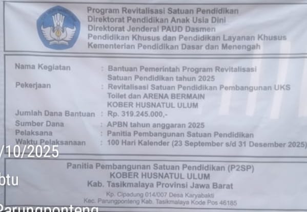 Program revitalisasi satuan pendidikan tahun 2025 yang digulirkan pemerintah kembali menuai sorotan. Kali ini, dugaan penyimpangan muncul dalam proyek pembangunan di Kober Husnatul Ulum, yang berlokasi di Kampung Cipadung, Desa Karyabakti, Kecamatan Parungponteng, Kabupaten Tasikmalaya.
